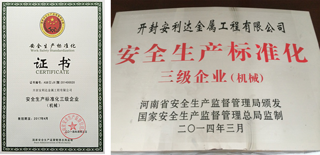 2014年6月,開封市安全生產監督管理局為開封安利達金屬工程有限公司頒發“國家安全生產標準化三級企業”證書。