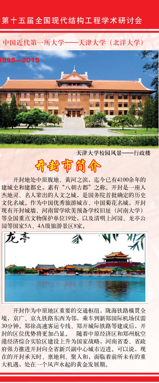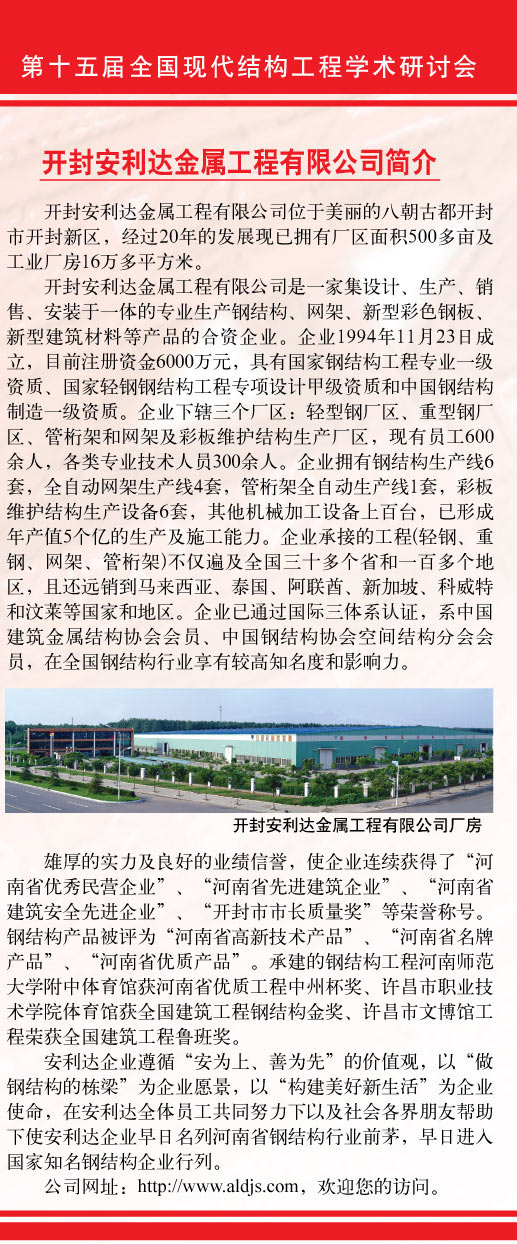2014年11月16日,第十五屆全國現代工程學術研討會主辦單位天津大學陳志華教授、閆翔宇博士、王霄翔秘書及組織委會委員張智升、劉洋等人來開封及承辦單位開封安利達金屬工程有限公司就研討會會議場所、會議時間、會議學術員會及組織委員會名單進行調研,調研后經協商會議場所定在開封中州國際飯店,會議具體時為2015年7月24日至27日,并隨即下發了第十五屆全國現代工程學術研討會【第一號通知】(征文)。