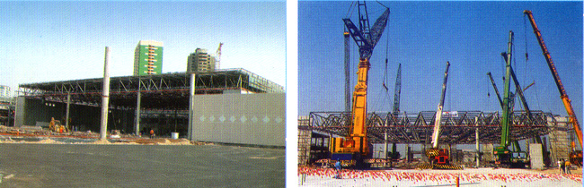 本工程有4塊54*72m網架組成,每塊網架在地面拼裝,用4臺300噸加2臺200噸吊車整體提升就位。